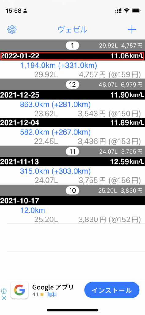 1月の燃費 Twitter Facebook はてブ Pocket LINE コピー 2022.02.19 2022.01.23 1月の燃費の記録。コロナ禍のため遠出はせず、街乗りのみでした。 上図のように、「11.06km/l」という結果に。寒い日が続いているので、車を暖めてから乗っているせいか、どんどん燃費が悪くなります。 ちなみに、車の燃費計は次の図のようになります。 「12.1km/l」でした。多少の誤差はあるものの、寒くなるごとに燃費が悪くなっていることがわかります。